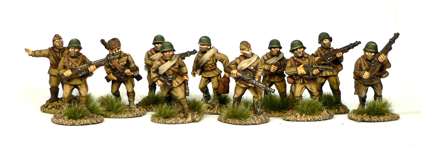 Here is a simple rifle squad. Or at least it appears to be. Two of the miniatures are actually wrong – one is a medic and the other is a guy who should be holding a tank rifle… but I’ve lost the rifle! I hope to find it again.