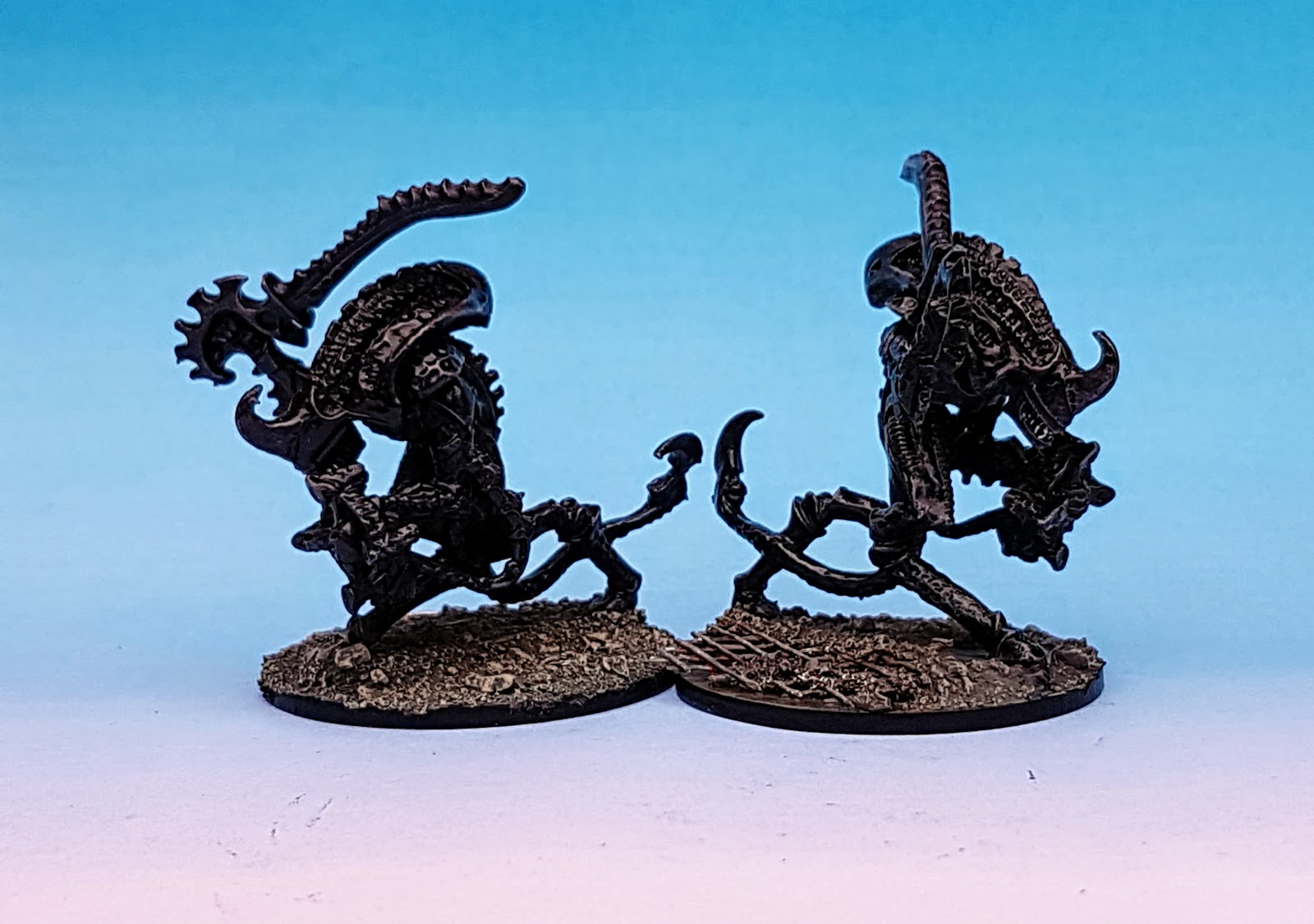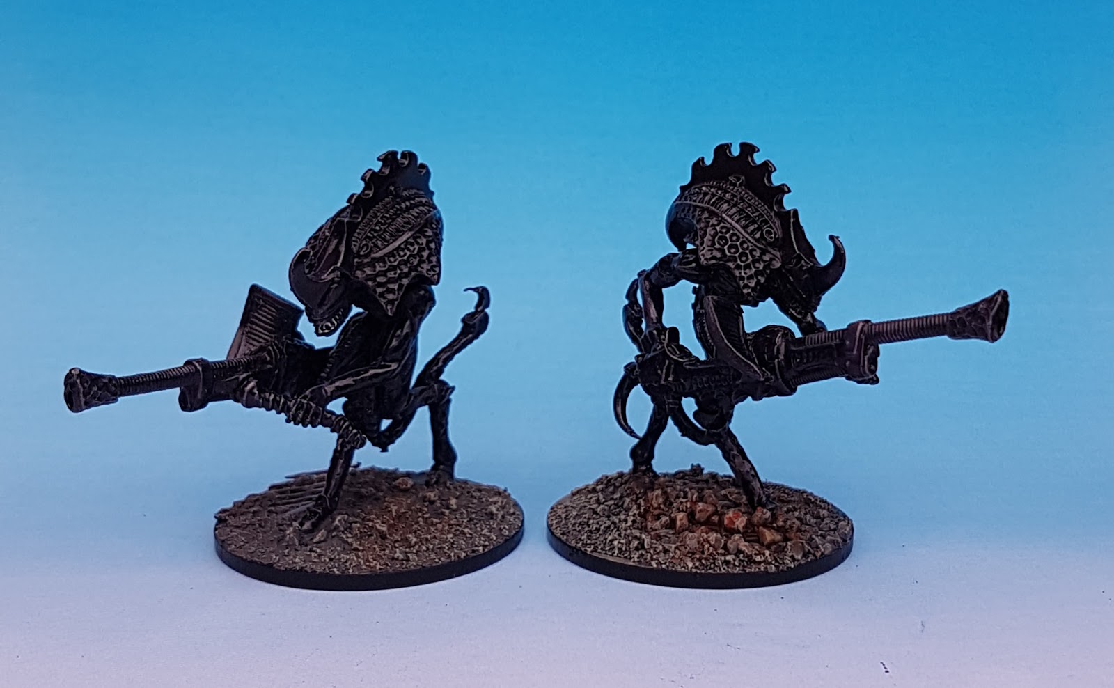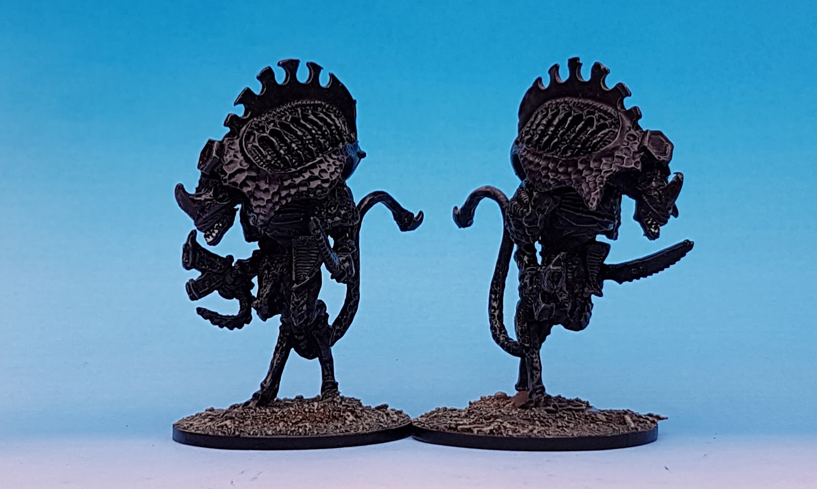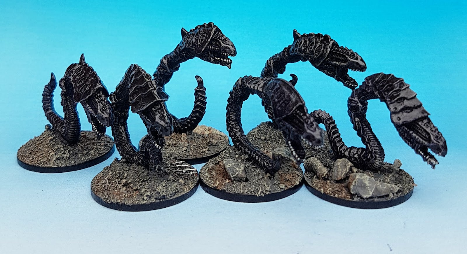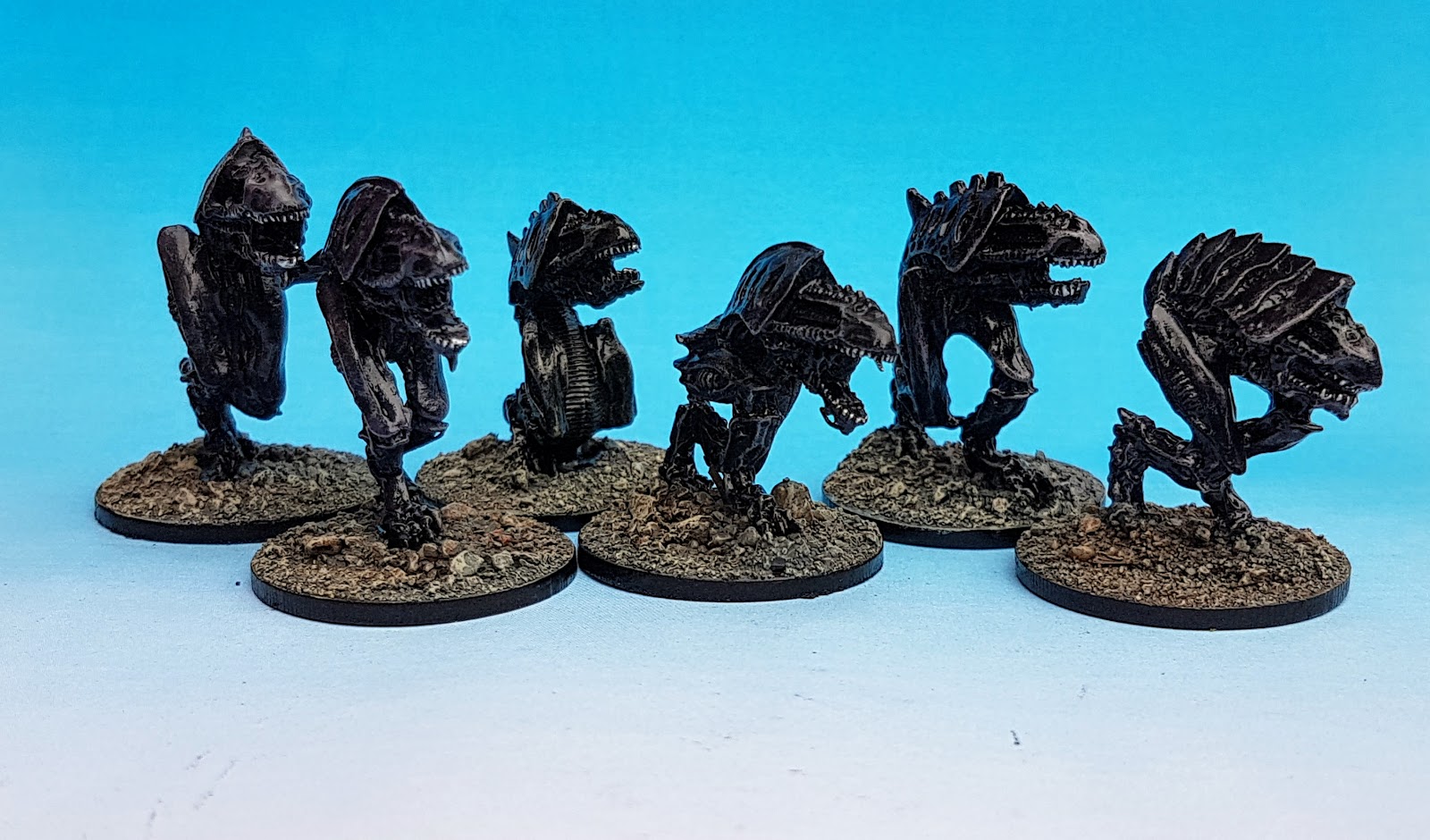 Painting wise I simply did what I do and drybrushed them on a black undercoat with a green greyish Vallejo, dowsed them in purple ink and gave them a quick 2nd drybrush of green grey. Then picekd out the teeth in silver and killed it all with gloss varnish.