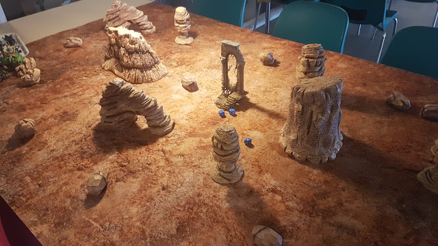 A table available for a pick up game. Incidentally it looks a lot like the table I am contemplating for my AoS. I really like it. I wish I knew where the mat was from. Any pointers on that would be welcome.
