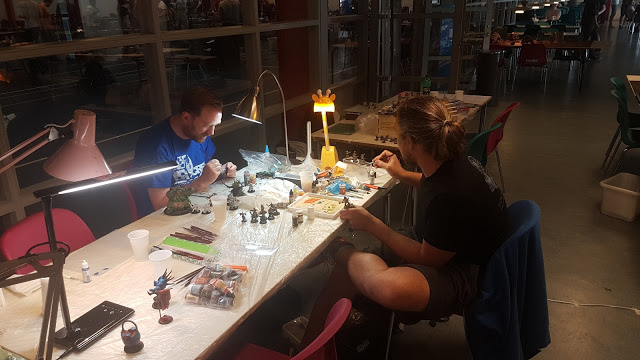 The troop arranging the convention had done a splendid job at including all the various aspects of the hobby. There were free tables for pick up games, a demo table for newbs, a nice cafeteria, and a large area dedicated to painting miniatures for those so inclined.