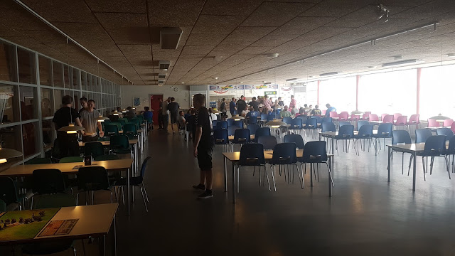 A huge cafeteria with a bit of Bloodbowl going on. And a lot of food.