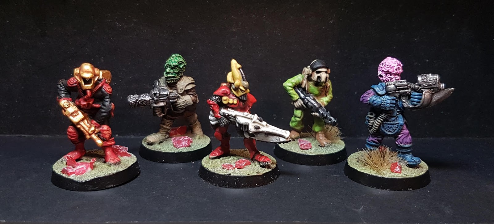 I  the next couple of posts I will detail my Rogue Trader efforts in gaming and painting starting here with a motley crew of figures painted for an on going campaign: