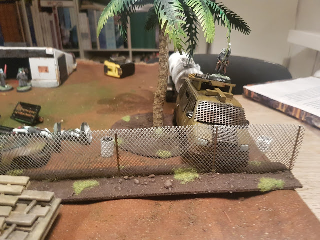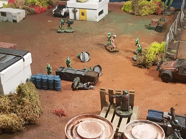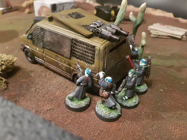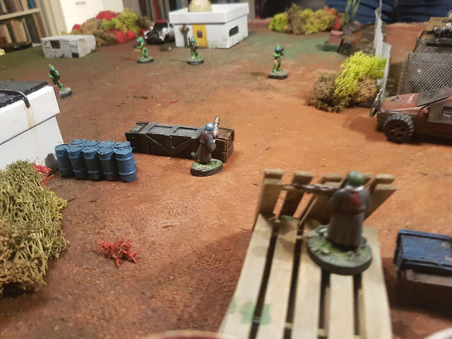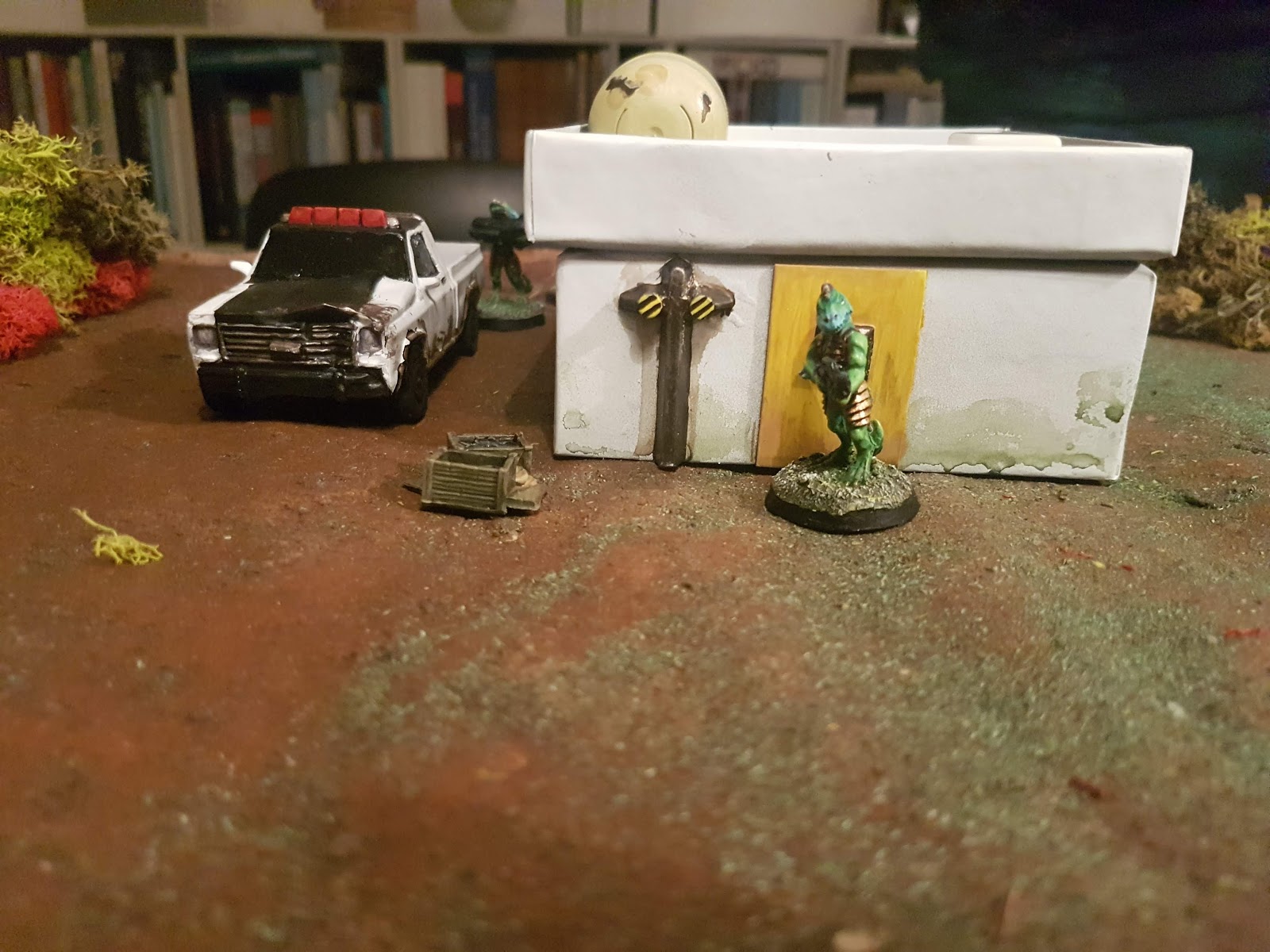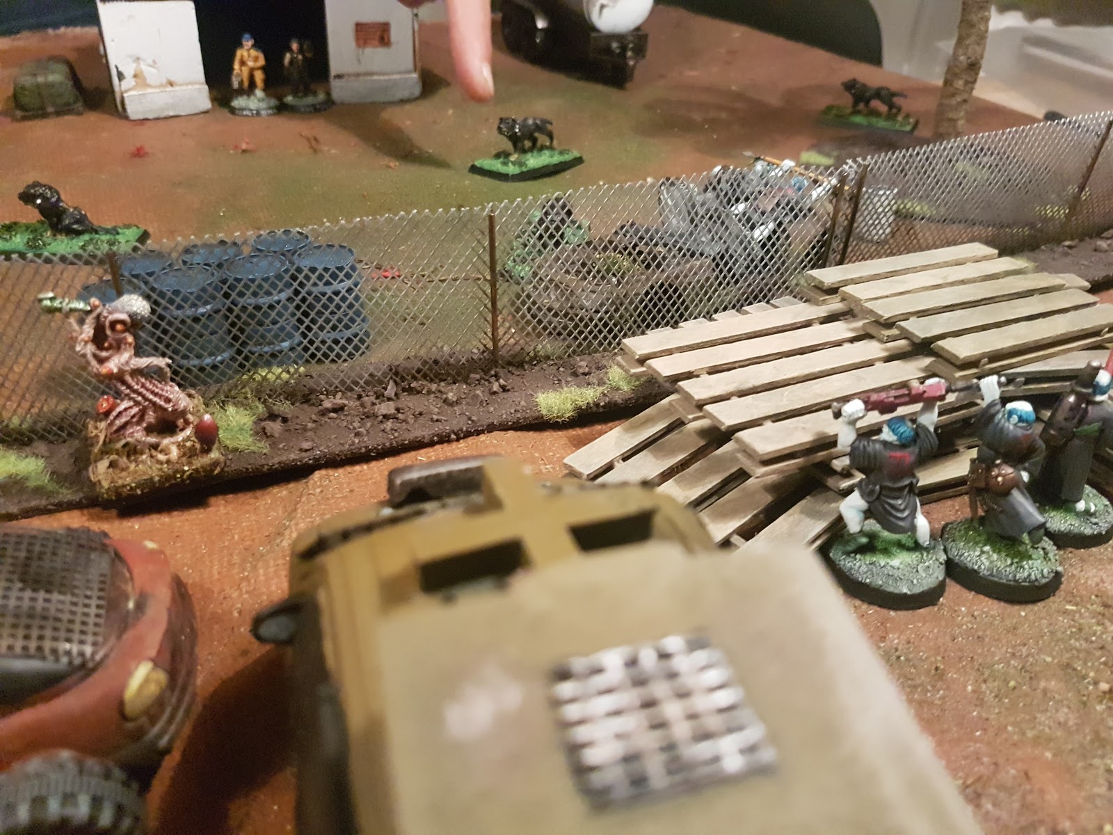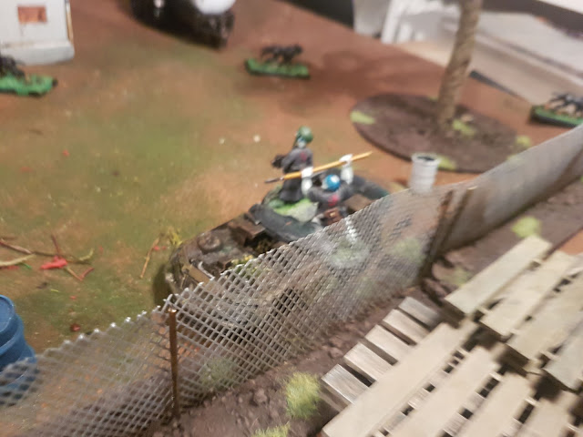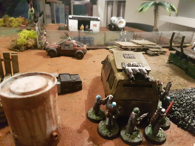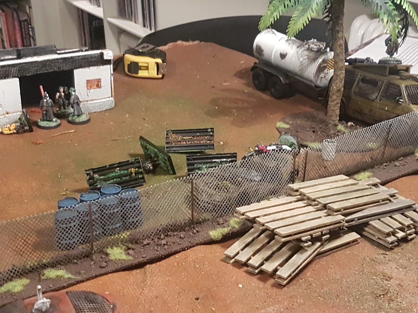 An especially cunning lasgun wielding brother took position behind cover to get the best shot at the Iskwarians as they exited their compound. The car had now been started and was going straight for the fence.