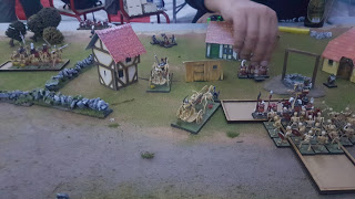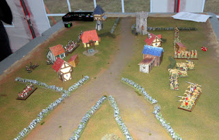 Terrain: A village of 4-5 houses lines a crossing on the road. A well is situated nearby along with some fields and hedges.