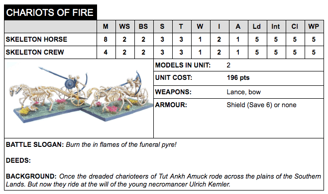In undeath the charioteers ride to set the world ablaze and nothing soothes their empty souls more than the sight of the flaming skulls of their enemies as they race across the landscapes.