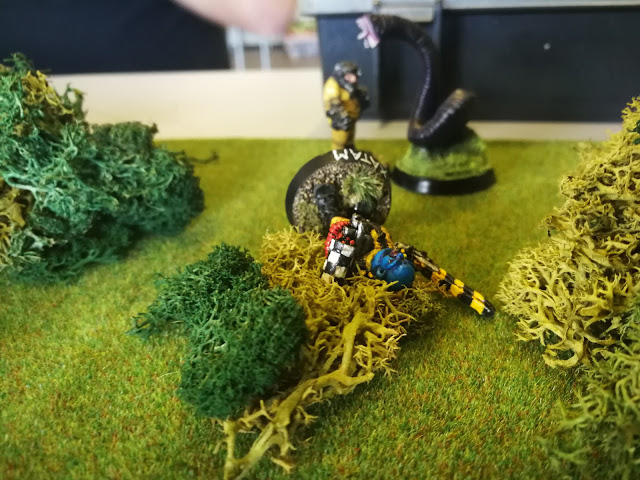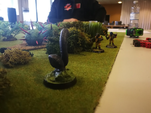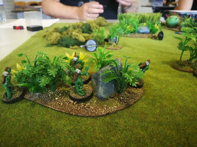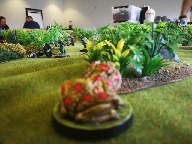 A toxic amphibo is drawn by the noise, and being natives of the jungle the Saurians are not late to start changing their priorities, trying to down the great toad.