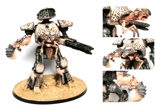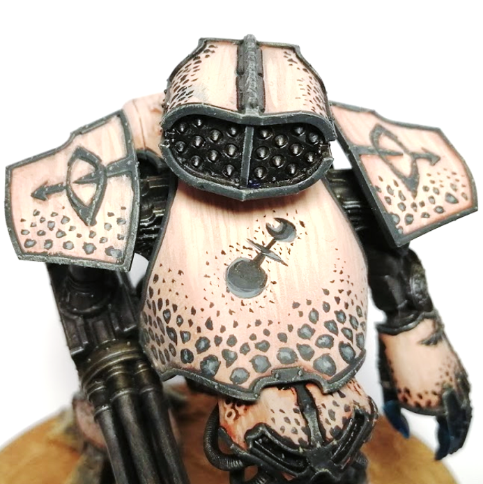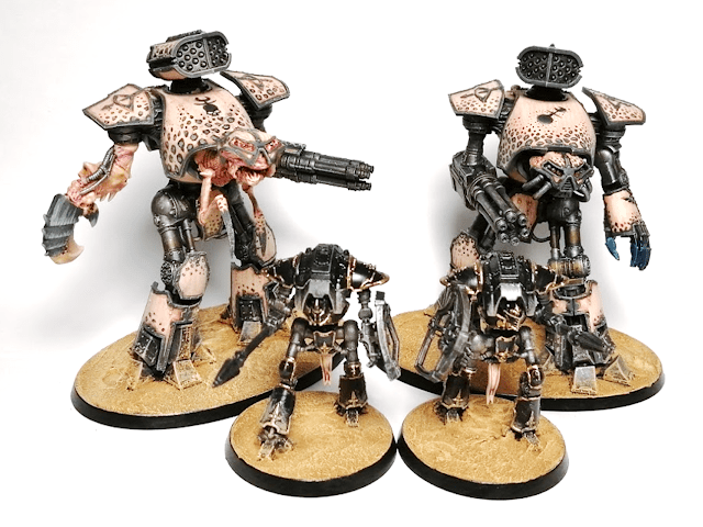 After a lot of struggling with regards to colours and schemes, I decided to join the loyal forces… of Horus! While the setting is firmly set in the 30k universe during the Horus Heresy and the amount of mutation and warping of the god machines probably shouldn’t be too great at this stage, I opted to show the aweful powers of chaos directly in my titans. So some of them are a bit warped. or have organic matter protruding the hulls of their armour.