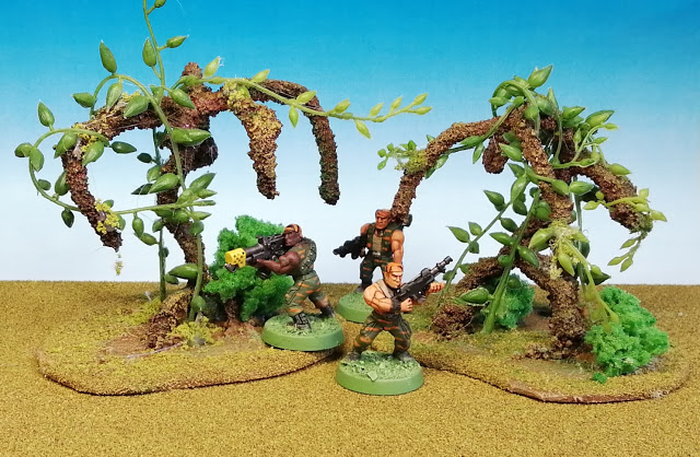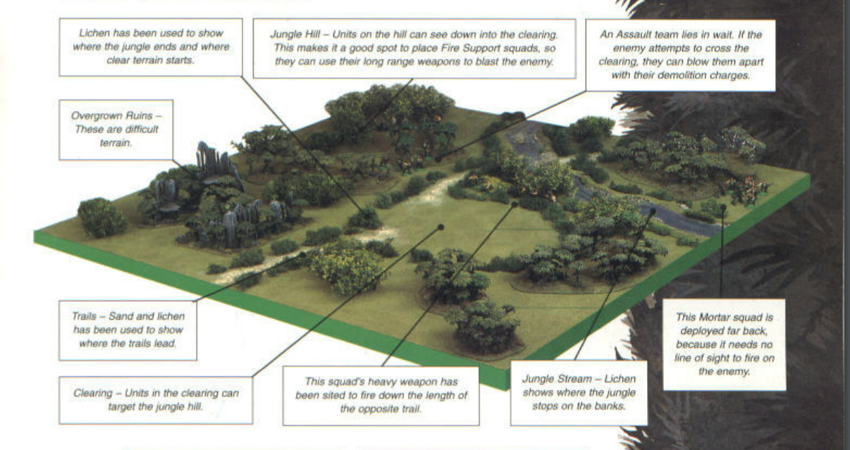 Ever since I saw the above picture in the Catachan Jungle Fighters codex in the 3rd edition of Warhammer 40.000 I have been enamoured with the idea of making a jungle board similar to this.