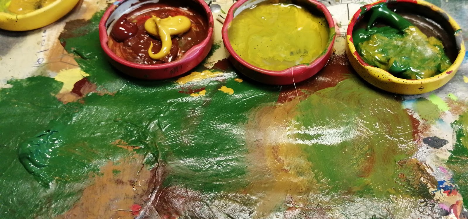 Step 4:I paint the trees by drybrushing them with burnt sienna (left image) followed by dashes of green and yellow ochre (right image). I try not to be too particular to give them a bit of different colour play.