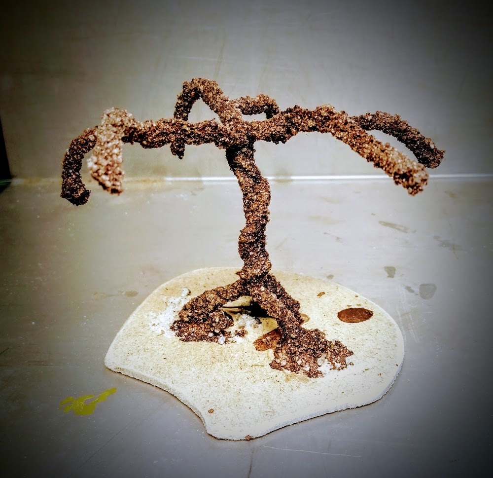 Step 6: Sanding the tree. Once the tree is soaked in NMN:water mixture it is put in a container holding sand, and sand is sprinkled all over the tree. You will find that after a minute or two the NMN:water mixture will have bled through the sand and a consecutive round of sand can be added if you so wish. It is imperative not to touch the wet tree too much as the sand easily comes off at this point. Once filled with sand, allow it to dry overnight. It is best to let it dry on a smooth plastic surface so that you can easily remove it afterwards.