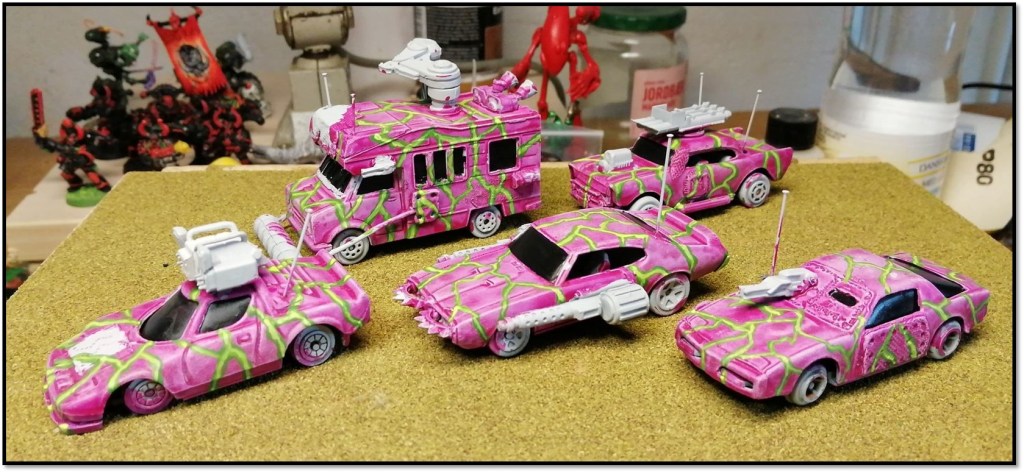 I did not go quite as much overboard with the end result and ditched the flames altogether… I used the Games Workshop Greyseer primer. And then simply made a wash of Warlock Purple. I have always found this particular colour extremely well suited for washing. After washing the cars got a pink drybrushing.