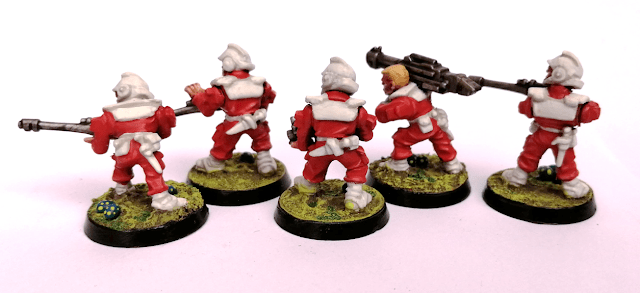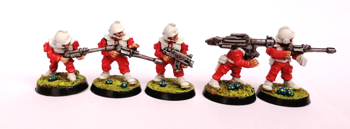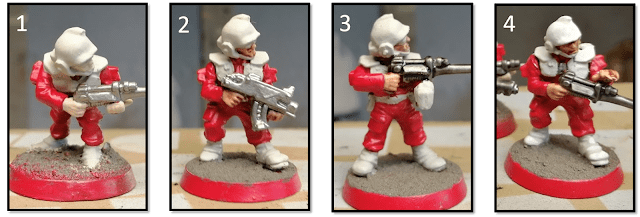 Cybersecurity Painting Guide. The models are primed red with Armypainter red spray. (1) This is followed by blocking out the colours first. I paint the skin, shoes, armour and helmet in Vallejo Deck Tan. Deck Tan is my go to colour for most lighter nuances as it covers really well, while at the same time allows light colours to be applied afterwards. The guns and metal parts are painting Armypainter Gun Metal. When this has dried I add Vallejo Medium Skin Tone on top of the Deck Tan for hands and faces. Next the various washes go on. (2) The skin is washed with GW Contrast Darkoath Flesh, followed by (3) washing the metal with GW Contrast Basilicanum Grey. (4) Then the Deck Tan is highlighted with Vallejo Off White. I water down the white and give it several coats. To take it to the final images I highlight the red with a mix of Vallejo Blood Red and Vallejo Beige, and glaze it with GW Bloodletter Glaze. The skin is highlighted with Vallejo Medium Skin Tone, washed with GW Reikland Flesh Shade and highlighted a final time with Medium Skin Tone. The shades are painted Vallejo Glorius Gold, highlighted with Vallejo Polished Gold and a final highlight with Polished Gold mixed with Valljo Chrome. That’s it!