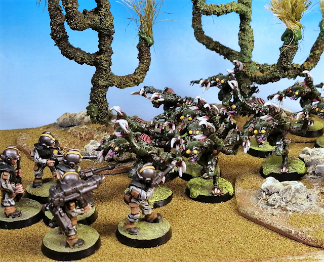 Guardsmen of the 88th Stormbringers try to still an oncoming horde of nox runners that are rampaging the settlement of the north.