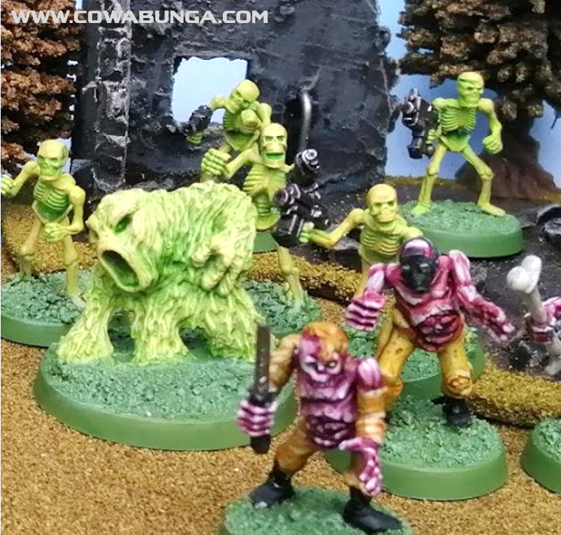 A few very zealous followers of Neergol have been entirely transformed by working with the nox fuel ore. I used a few old skeletons to make these guys. The base was Vallejo Pea Green, drybrushed with Vallejo Lime Green, white and sulphur yellow was added to this to increase the highlights. Lastly the figures were washed with fluorescent green to give them a glow. The weapons were painted Army Painter gunmetal followed by Basilicanum Grey contrast wash. By the way – if you managed to read this far, please do leave a comment! I don’t even think it requires you to log in. ;-D