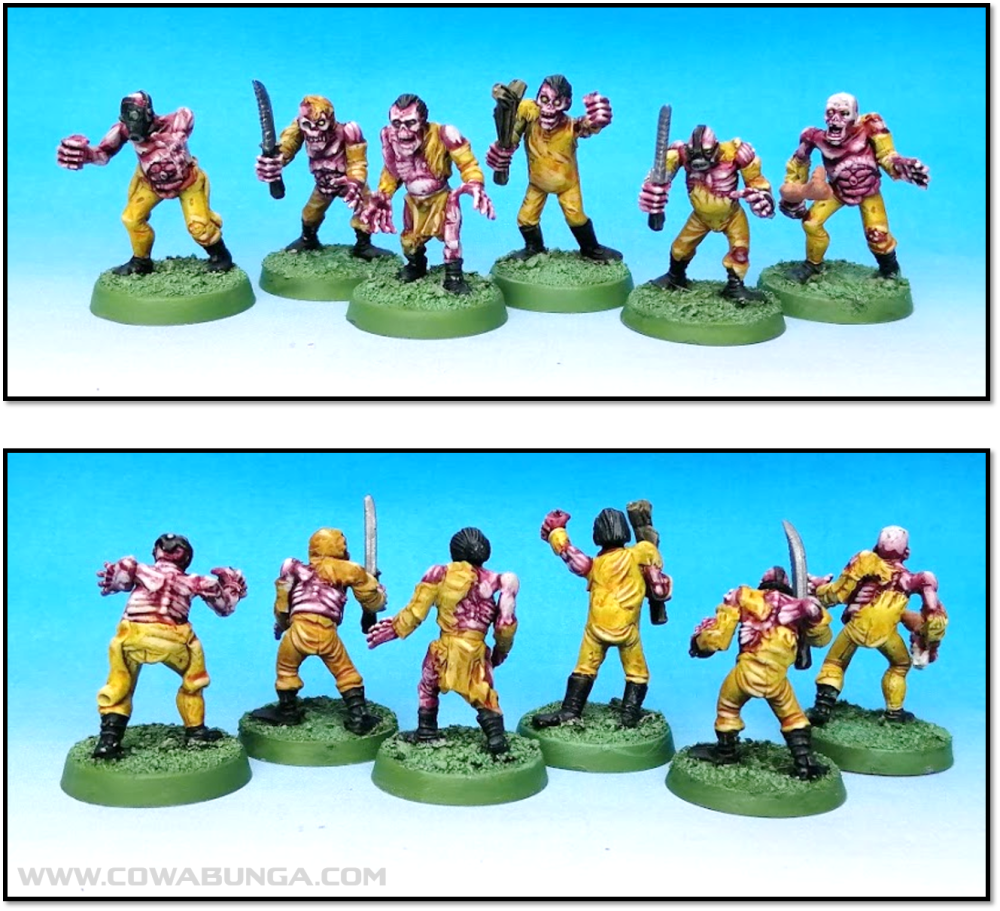 To make the workers of Chernogood I brought out my good old trusty Games Workshop (GW) zombies. This plastic kit is easily one of the oldest still in production. Today they call them ‘deadwalkers’ and the box has been updated, but other than that the song remains the same. These guys were notorious for being part of the bubble hands and heads period at GW, but also because several of the figures seemed to have unnatural features. For instance the loose leg being held by one guy below has 6 tendons connecting to 5 toes. I believe some of the hands have 4 finger joints too. Happy days!