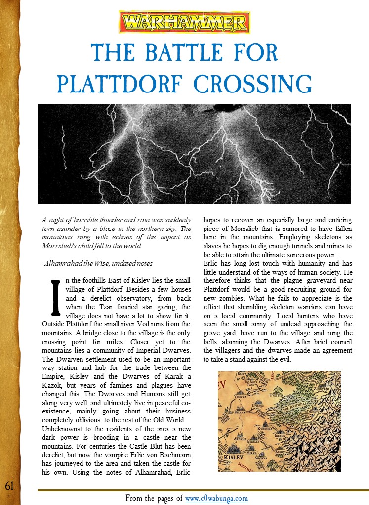 IN the foothills North of Praag lies the small village of Plattdorf. Besides a few houses and a derelict observatory, from back when the Tzar fancied star gazing, the village does not have a lot to show for it. Outside Plattdorf the small river Vod runs from the mountains. A bridge close to the village is the only crossing point for miles. Closer yet to the mountains lies a community of Imperial Dwarves. The Dwarven settlement used to be an important way station and hub for the trade between the Empire, Kislev and the Dwarves of Karak a Kazok, but years of famines and plagues have changed this. The Dwarves and Humans still get along very well, and ultimately live in peaceful co-existence, mainly going about their business completely oblivious to the rest of the Old World.
