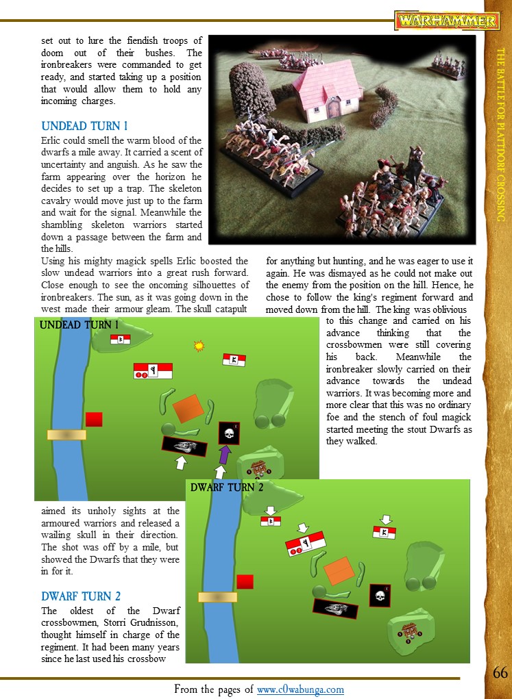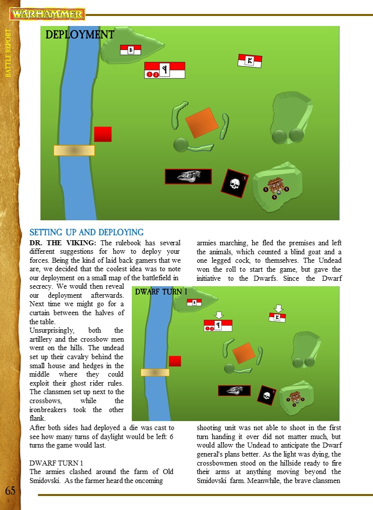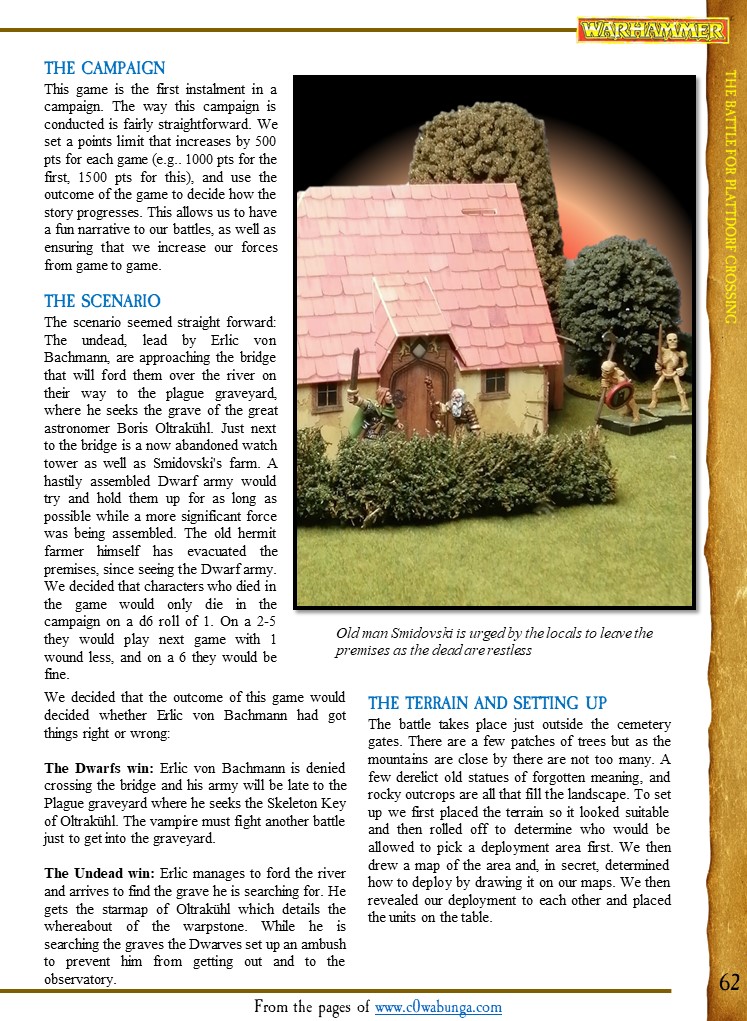 Since it was the first game in a series of games that Jonas (of Death World Adventures) and I was going to play, we decided to start out softly with 1000 pts armies. The scenario seemed straight forward: The undead, lead by Erlic von Bachmann, are approaching the bridge that will ford them over the river on their way to the plague grave yard. Just next to the bridge is a now abandoned watch tower as well as Smidovski’s farm. A hastily assembled dwarf army would try and hold them up for as long as possible while a more significant force was being assembled. The old hermit farmer himself has evacuated the premises, since seeing the Dwarf army. We decided that characters who died in the game would only die in the campaign on a d6 roll of 1. On a 2-5 they would play next game with 1 wound less, and on a 6 they would be fine.