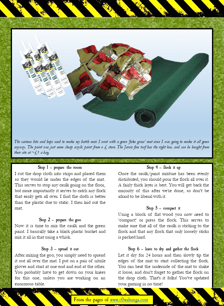 Here’s a small tutorial on how I made a battle mat for my games of Warhammer and similar grassy games. It is fairly straight forward, but I think the results are nice.