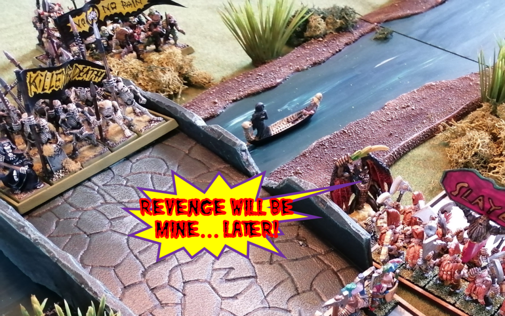 Without the Wraith the Skeletons stood no chance of even denting the Iron Breakers. Eventually Bhürzüm himself tried charging into to budge the Slayers from the bridge, but to little avail. He had been foiled by the mischievous Dwarves into spending too much time on artillery and cavalry sideshows, forgetting the true meaning of the battle.
