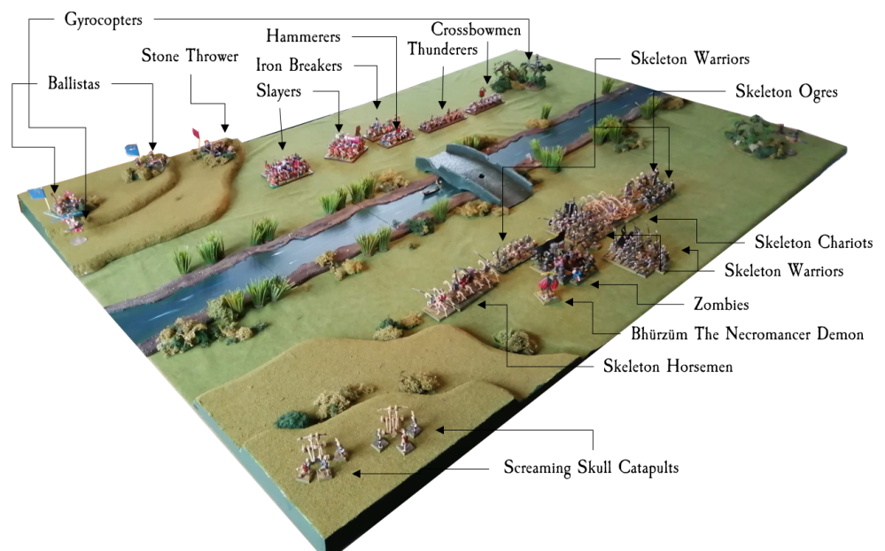 King Belagor chose to go North West. Here his scouts soon reported that a single bridge was the only thing connecting the small island on which the army had landed, with the main island of Khardon. The scouts further reporter that gigantic bats were seen approaching the bridge from North East. Not scared by this, Belagor decided to try and take the bridge. What Belagor failed to appreciate was that the incarnate evil, a demon necromancer abiding the name of Bhürzhüm stood on the other side of the bridge ready to face the Dwarves.