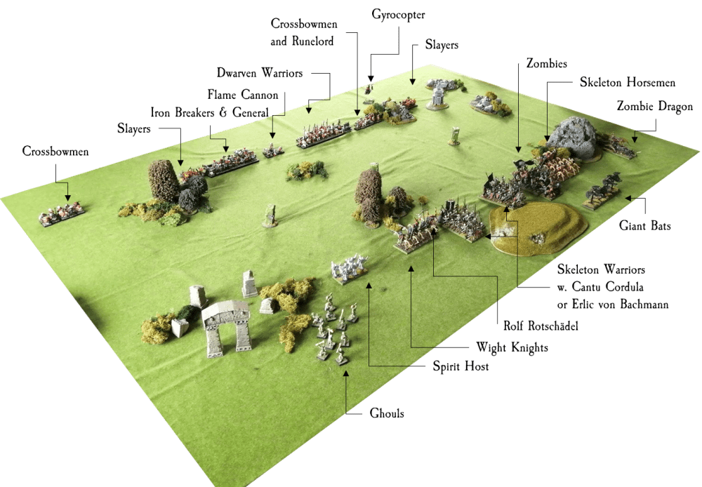 The Dwarfs had arrived at a place of ancient mysticism. 3 grotesque pillars of elemental evil had long ago been erected and were emanating a field of dark magic. Something had to be done about it, and the Dwarfs decided to go head strong and take the pillars. The forces of Cantu Cordula had fled to this place of unholiness after the defeat in game one. Now the count was ready to defend it with all his might. His trusty lietenant Erlic von Bachmann was by his side, as well as the re-assembled King of The Dead on his mighty Zombie Dragon Vera.