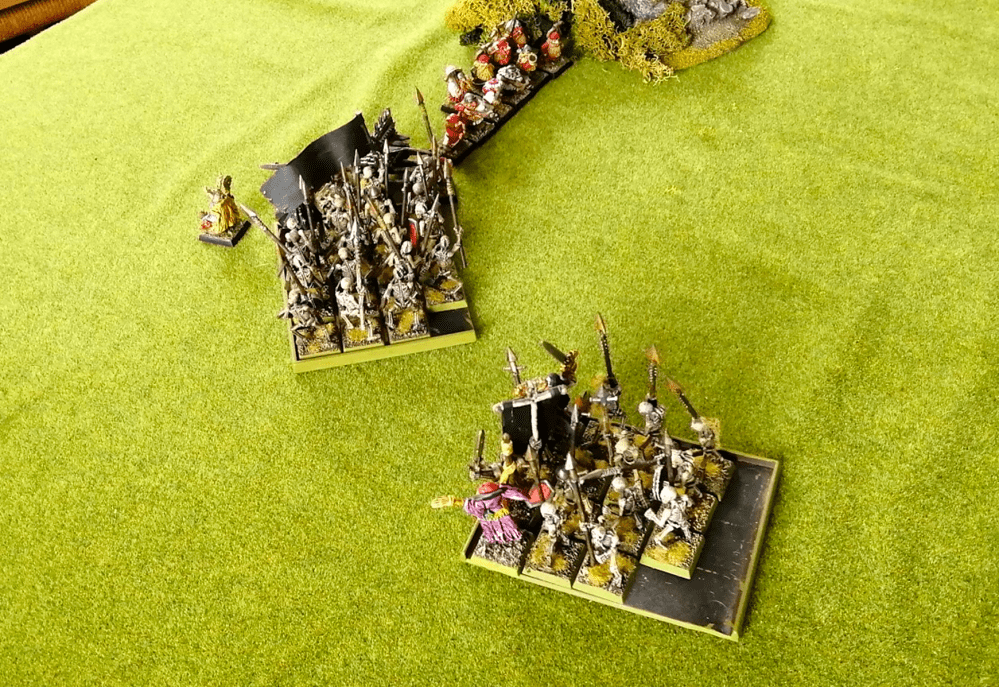 I had chosen the spells: Vanhel’s, Summoning Skeletons and Gaze of Nagash for my Master Necromancer, Rolf Rotschädel. It quickly turned out that the Dwarfs were packing quite a few anti-magic banners and whatever else. I realised that going for the power 1 summoning spell was a mistake. I should have taken the power 2 allowing 2d6 Skeletons to be summoned. This way I could have kept summoning small units to take objectives, making it really hard for the Dwarfs.
