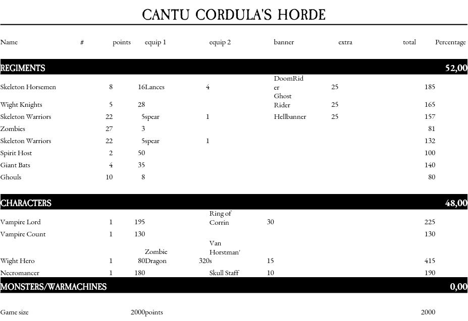This brings me to a pet peeve of mine: I really love the Undead, but I feel that unless I bring Vampires I do not stand a chance. The Skeletons die very easily, and the other characters won’t make a scratch in most regiments. I don’t mind Vampires per se, but I feel that some sort of build with a Wight… but the Vampire Hero is 130 pts and the Wight Lord is 120 pts and has inferior stats at every position. I don’t get it. If you have an idea for a fun but powerful non-Vampire character build, let me know in the comments!
