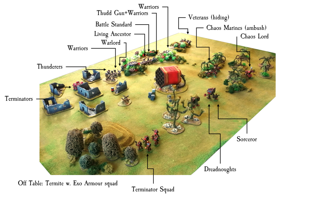 But then something started stirring! A Termite borred it’s way up through behind the lines of the Chaos Marines. Just wihtin range of both the Sorceror and the Marine squad (which had relocated towards the objective as per the plan above).