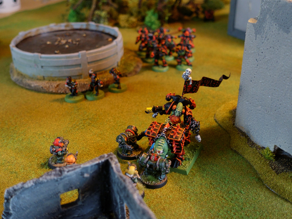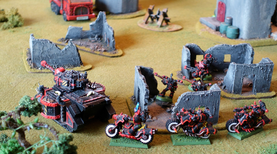 The Chaos Bikers directed their whitewalled tyres towards the Squat infantry and went for a full on hit-and-run attack. This is such a cool feature in 2nd – all bikes are allowed to perform an H2H on a single model they pass in the movement phase (but lose their shooting that turn). Probably, I would have been better off just shooting the twin-linked bolters but hey – it is hit-and-run!
