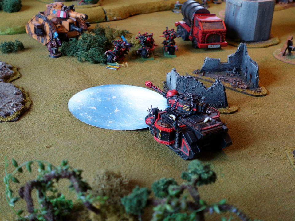 The CSM bike leader who was now out of control set the course for the rest of the squad. They headed towards the main Squat line. It wasn’t terribly bad, and might still cause some fun I thought. They trained their guns at the Squat commander, but as he was wearing a Displacer Field he bounced all over, and ended up next to the Leman Russ.