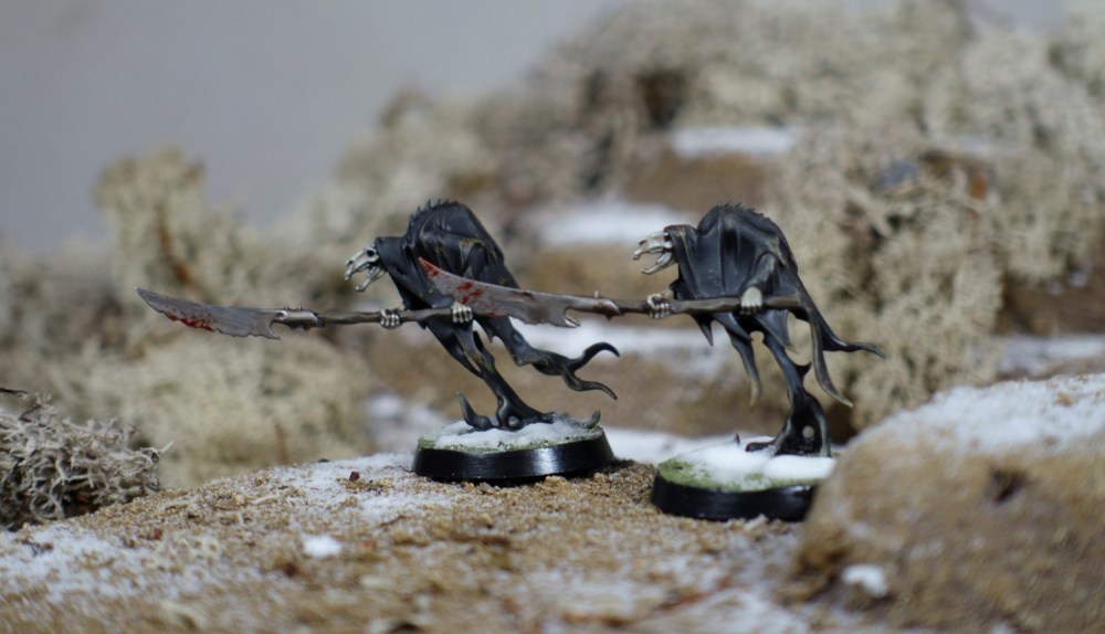 Paintingwise I went for a dark and gloomy approach. I had found many inspired examples of how to paint the miniatures online, but somehow most of them didn’t sit right with me. I found out that it was mainly the ‘ethereal’ part of the miniatures that didn’t work. Some of the long-time followers of this page, might be aware, but I have a strong dislike for ‘physical effects’ in miniatures. Smoke clouds and flying skulls and so on… Modern GW miniautres often have these things, which greatly detracts in my opinion. I think it is due to the fact that smoke is semi translucent… and in miniature it becomes totally opaque.