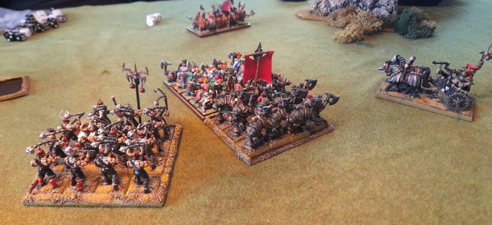 The Dwarfs deployed in a defensive manner, ready to stop the oncoming chaos horde. As the Chaos force was essentially meant to depict to smaller warbands joining up, I kept them in these during deployment. Shars’lo and his Dragon Ogres and Minoatures took one flank, while Warlord Kheothul took the other.