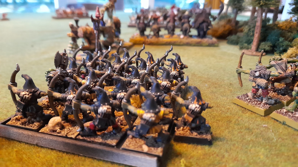 The same goes for the Goblins. The had dragged along some wild Orcs and a Shaman (lvl 2) as well as an Orc Boar Rider Warlord carrying Morghor the Mangler. Each Night Goblin regiment contained 2 fanatics and one of the fanatics in the spear unit had Mad Cap Mushrooms. Mmmmm yummy! Gaggalak (Shaman lvl 3) joined the arrow Gobboes. Story wise Gaggalak is the leader of the force, but within the confines of the rules the Orc Warlord is the general.