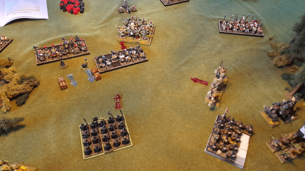 The Goblin schemes slowly unfolded. By the Winds of Magic the Wild Orcs were transported into the rear arch of the Dwarf hammerers.