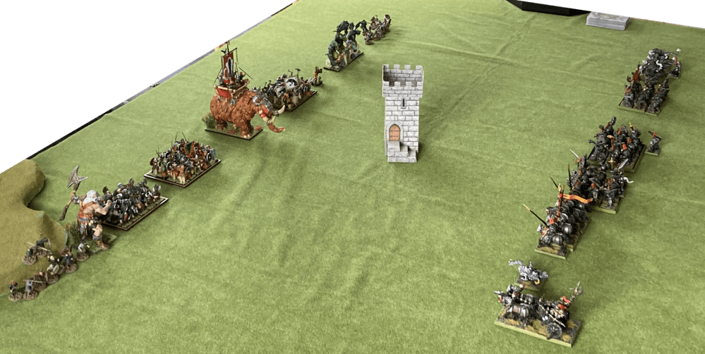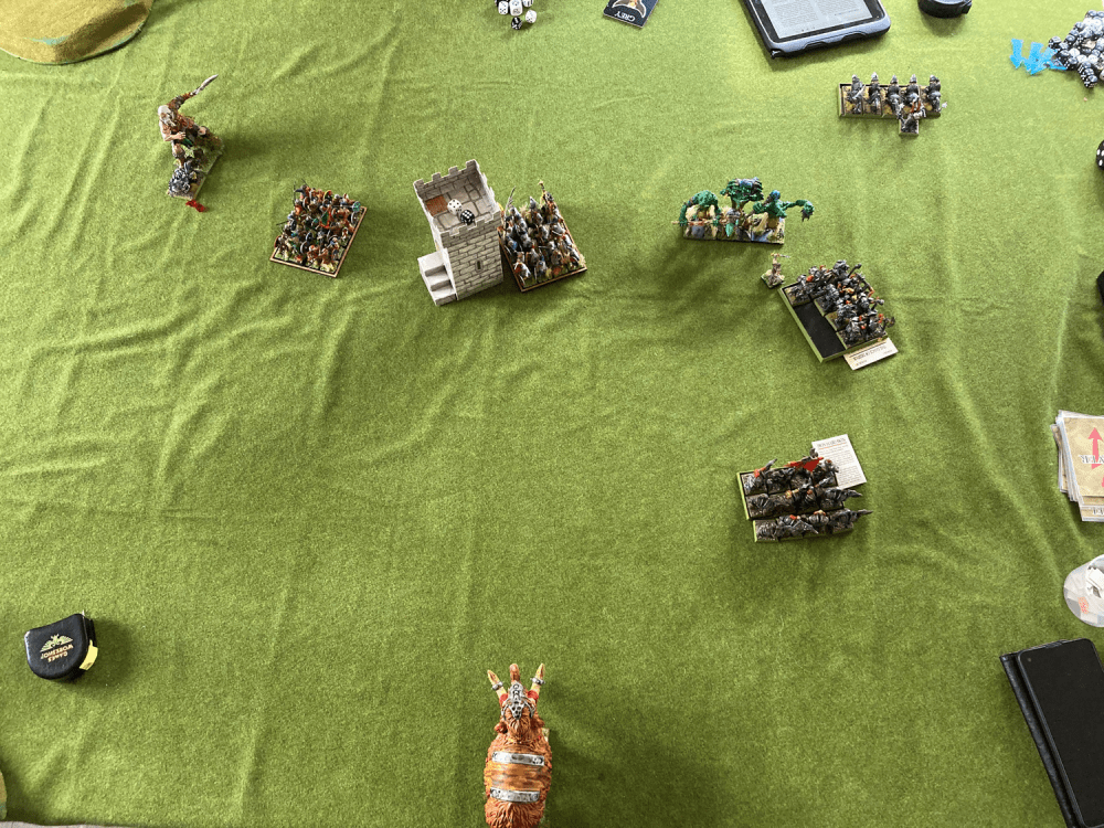 This game had it all – if by ‘all’ you mean every conceivable statistical anomaly. It started well, the Norscans got the first turn, and due to secret deployment ‘The Axecutioners’ which was my dedicated large target killing regiment, were stranded on the far side of the large targets… whoops!