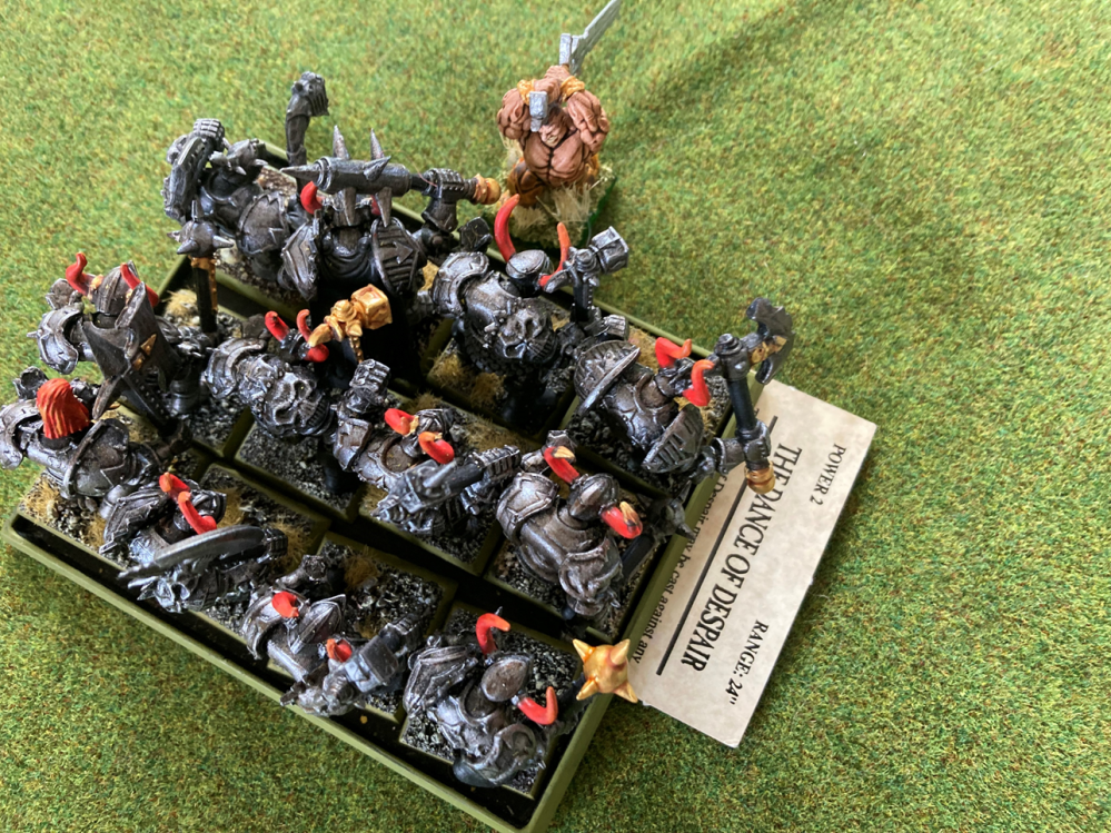 Well well well… I wanted to test whether a magic-less army would fare notably different than an army with a little magic (a lvl 2 and a dispel scroll). The answer – in this extremely unscientific experiment – is a resounding yes! Playing without ANY magic at all puts you at a massive disadvantage. Only 5+ on dispel attempts with the Winds of Magic cards, IF you get any… None of the special cards can be used and you cannot Drain Magic or hold a card from turn to turn.