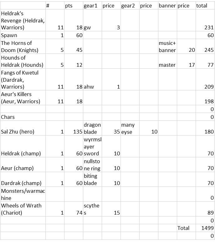 The Chaos Army had booted their Chaos Hero and hired a Chaos Sorcerer (lvl 2) instead. That was more or less the only change. (well… and an extra beast master which I forgot to include).