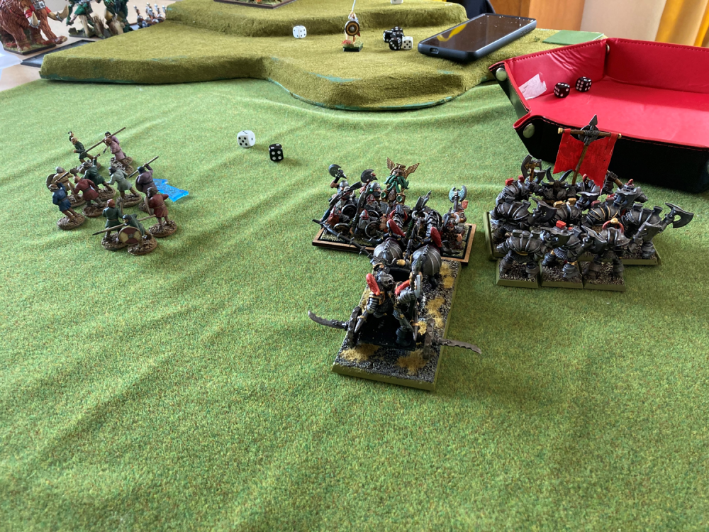 The Norscan mammoth made a succesful charge on the Fangs of Kwetul… who had just been mauled by a Berzerker too. The regiment lost 4 to the berzerker, and then 7 to the mammoth (4 on impact, and 3 on combat). That left only Dardrak the champion, who inflicted a single wound and then ran off… 10″ with the mammoth in hot pursuit (9″).