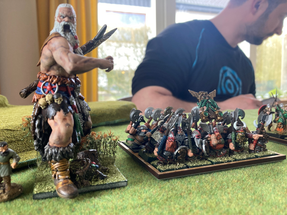 I then tried to fight my way back in the game. The Norscans were in dire lack of any leadership giving characters, so the plan on the left flank was simple: Break the Dwarfs and see the Giant (ld 6) , the warriors (ld 7) and the thralls (ld 6) run off! The Dwarfs were easily eviscerated! YES! But NO… the warriors rolled 6, the Giant rolled 5 and only the pesky thralls legged it for the leadership. So the plan failed.