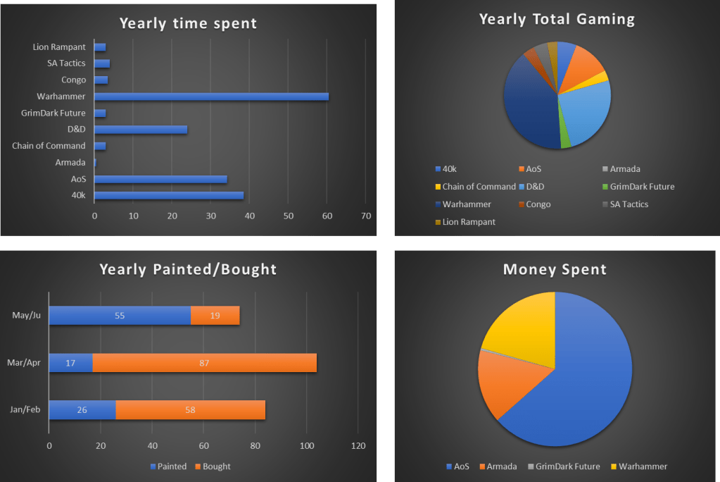 May/June was the first bimonth where I managed to paint more than I bought this year! Wehoo! Age of Sigmar is still my biggest money sink, even though I just bought another Tiranoc Chariot, a couple of Wraiths and Arkhan the Black for my Warhammer armies. Together D&D and Warhammer constitute almost 75% of my gaming time. All things combined (gaming, painting, reading, writing) Warhammer is almost 35% of my yearly activity.