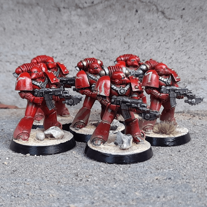 I have decided to paint my legion as Thousand Sons. I looked a bit at the Horus Heresy artwork but decided that I wanted hand painted logos instead of transfers. I really like these Mk VI armours, and I think they’re a really nice nod to the old Rogue Trader marines. I am trying my best to NOT paint these like my 2nd ed. So there are no highlights. Only weathering. I also didn’t go for metallic red as is the “norm” for these. Instead I am painting them Mephiston Red and then stippling them with Blood red. The idea is that they’ve made a “battle paint job” over their armour. I am working in small slogans, and graphitti, as well as variations to the exact scheme on each marine. Hopefully it will become a coherent mess.