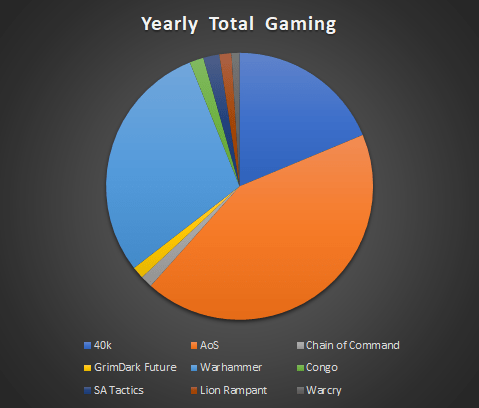 The yearly stats get more interesting as I go along too. Unsurpringsinly Age of Sigmar, 40k and Warhammer Fantasy are the games I spend the most time on. This I probably could have guessed. But the amount of small games I play on the side is a lot higher than I thought it would be. I used to deal heavily in this sort of gaming, but it seems I am keeping it up.