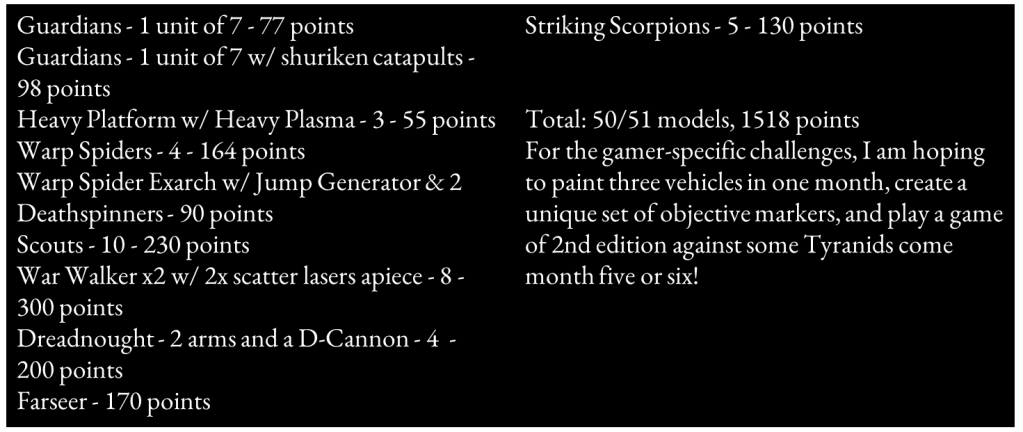 I’m excited to throw my hat in the ring for this 4th 40k2ndAC! I’ve followed the last three and have slowly been collecting a batch of Rogue Trader and 2nd edition Eldar in the meantime hoping to participate. For this go, I have 1518 points and 50/51 models (depending on how you count a heavy support platform :)) of Eldar. I am attempting the Gamer Challenge, as I hope to use these models soon in our local game store.