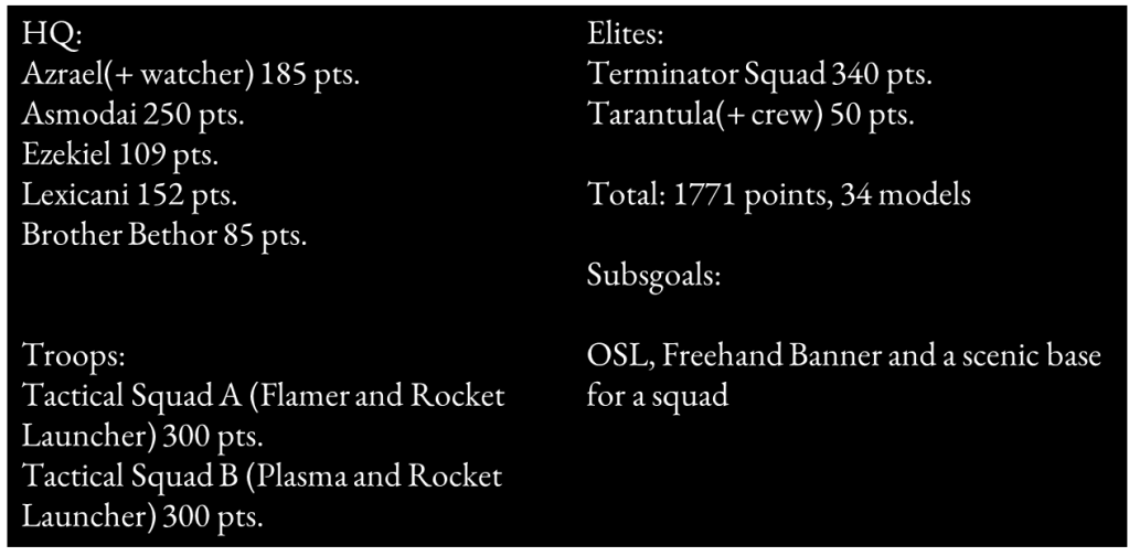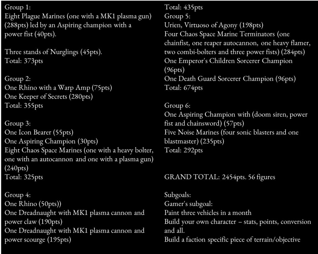 I should also say I will be taking part in the Gamer’s Challenge and have also included my army list below, broken into six separate groups as per the stipulations of the challenge. I’m not sure what order I’ll be painting them yet as there’s still some conversion and sculpting work to do here before the challenge begins, but see the photo below for what is included in each group and points will be laid out according to WYSIWYG. I can’t wait to start and look forward to seeing what the other entrants submit. Good luck everyone!