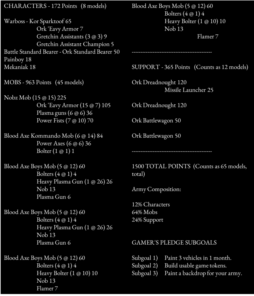 Soon after, I became interested in Tyranids, and played that army almost exclusively from 2nd edition through 4th edition (the last edition I’ve played). Over the next 30 years I’d gathered many more Space Orks, but have literally never painted a single one. That changes now. I’m hoping this 2nd Edition 40k challenge helps make a dent in my pile of Orks. I’ve been trying to paint an army over each of the last couple years, and managed to finish a large dwarf army (using vintage Grenadier and Ral Partha figs), and a large skeleton army (using a mix of vintage Citadel, Grenadier, Ral Partha, and some new Wargames Atlantic figs). I found that if I post my progress on Instagram, I tend to finish what I start. So those past 2 armies can be found there, as will this army. I know that I’m capable of painting alot of figs, but it isn’t easy for me. So I’m signing up for the Gamer’s Pledge so that I can paint a large chunk of my Ork backlog, but am tempering my expectations and not trying to paint a massive horde. Since I have all the usual grown-up obligations, it’s going to be a real task to find the time to paint all the figs to a level that I’ll be happy with. The army list I’ve built, though rules-legal and very balanced, was based entirely upon the models I wanted to get through rather than any sort of strategic planning. My army is an Ork raiding force led by Kor Sparktoof. It’s comprised of 65 models (equivalent), and is a mix of infantry and vehicles: enough variety to keep my enthusiasm up, but not an outrageous number of figs so that I lose all hope. Fingers crossed!