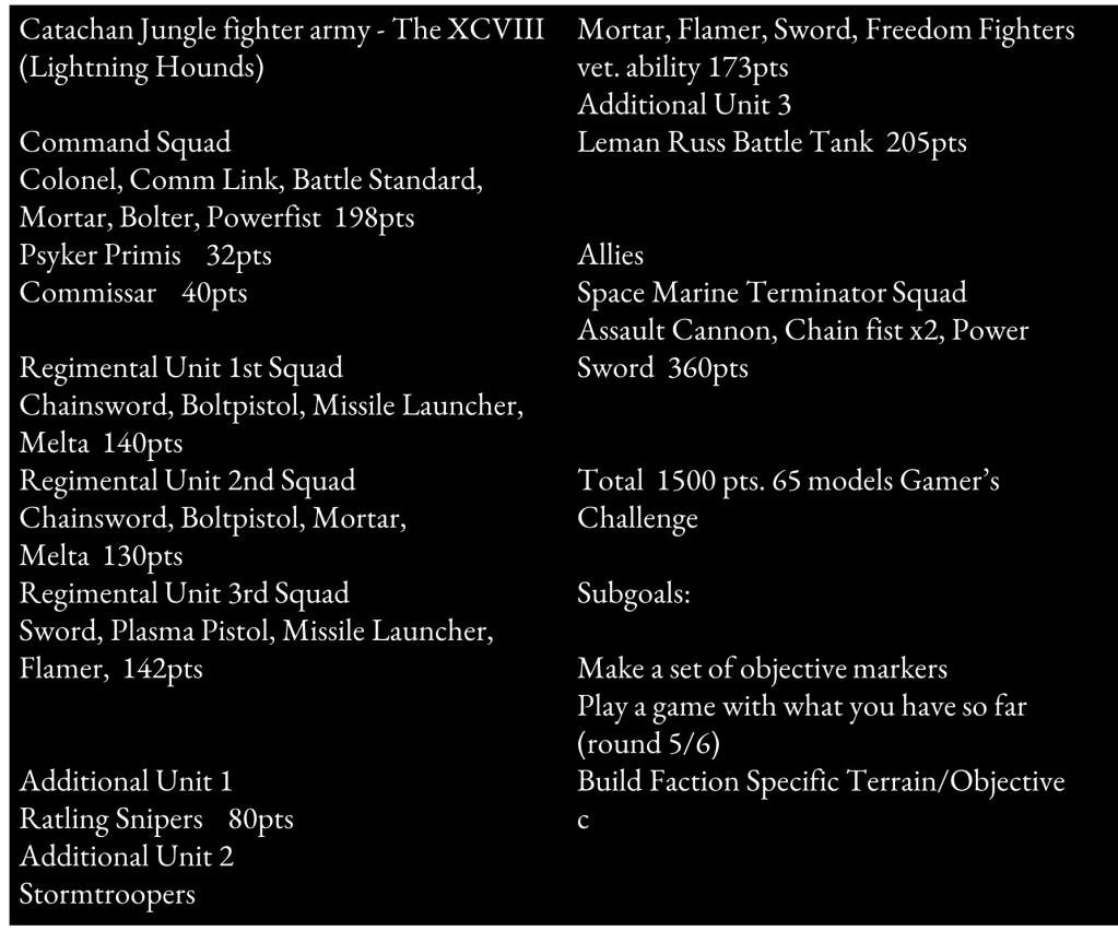 This is my Gamers pledge for a Catachan Jungle fighter army – The XCVIII (Lightning Hounds)
