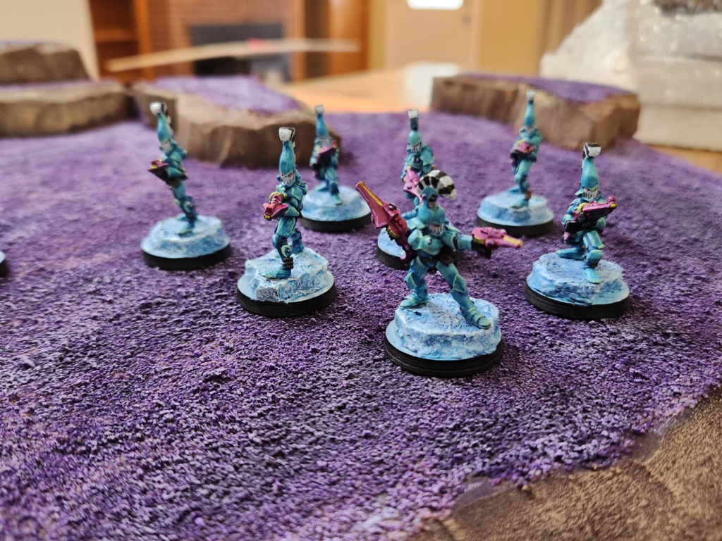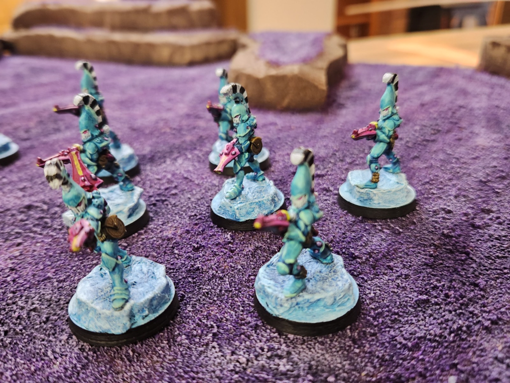 This month I have painted two units of 7 guardians. One unit is equipped with las pistols for 77 points, one unit has shuriken catapults for 98 points. I really got into these models, and enjoyed the proto-avengers best – even if o e ir two of their poses were a bit fallen over. I had some extra time due to a work trip which gave me hours of uninterrupted painting periods in the hotel room. I took advantage of that to paint a bonus guardian with las pistol for 11 more points. Our local scene plays much more 9th edition 40k than anything else, so the extra guardian and platform crew (coming later!) will let me field a full unit of 10 guardians as well as use the proto-avengers as dire avengers.