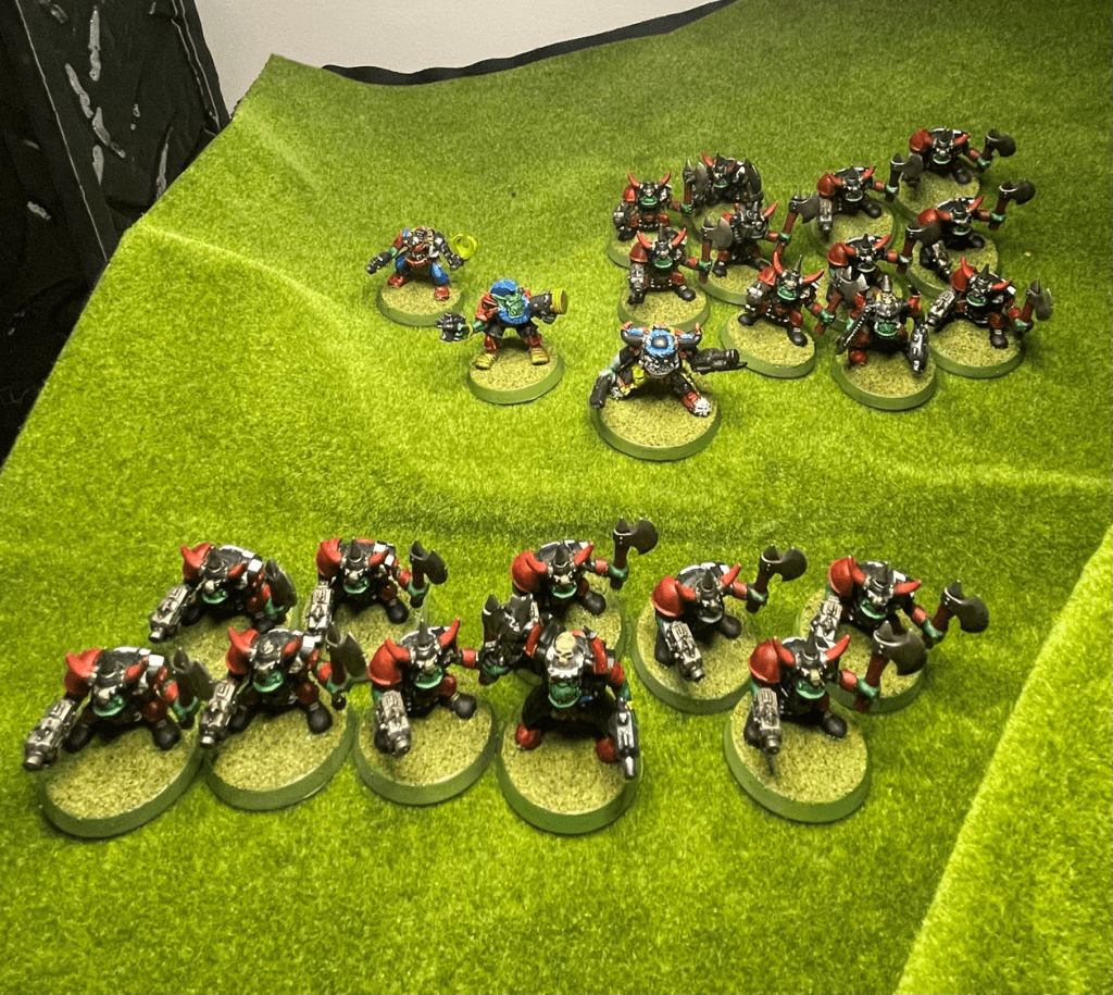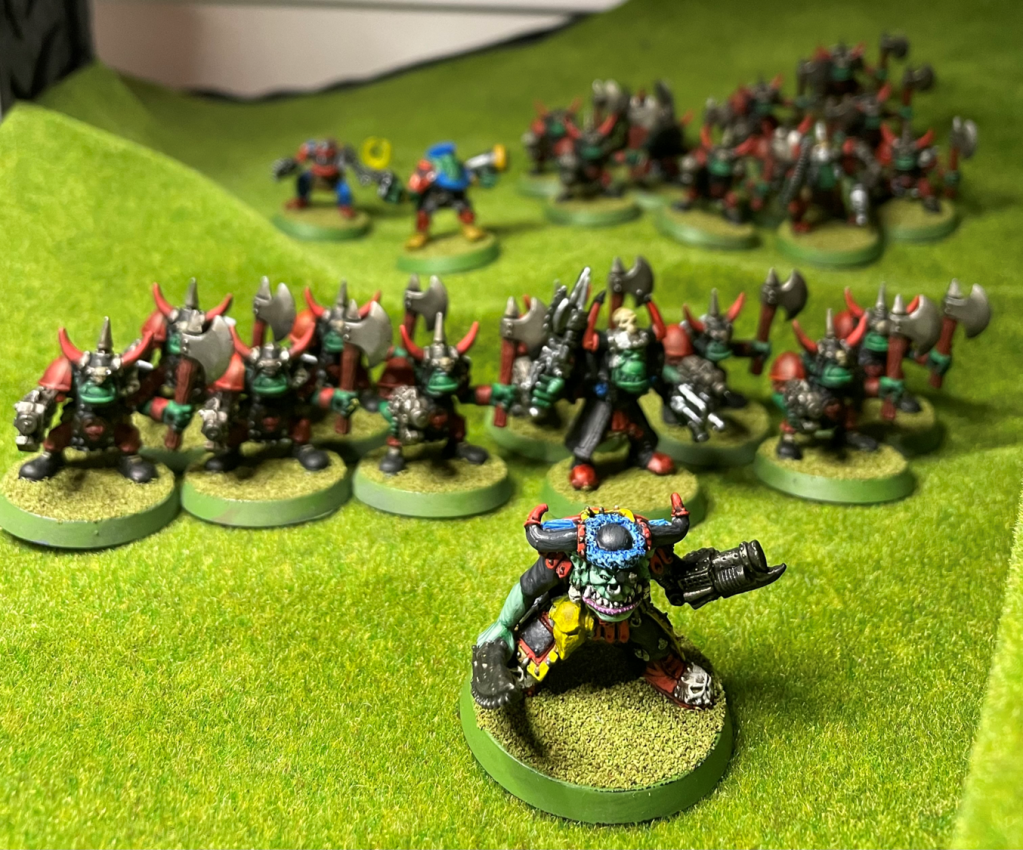 As you can see from the pics the warboss is definitely to a higher standard than the rest but there simply wasn’t time. But hey! They’re all painted and they’re 26 models! (I think, it’s late…)