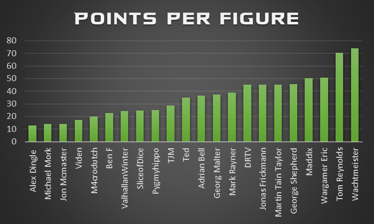 M4cr0dutch has been overtaken by a few this month in getting underpaid per model. Unsurprisingly both Alex Dingle and Michael Mork are putting in the work here. Perhaps more interesint, a painter – Jon McMaster – is also in the top three with just a little over 13 points per figure. At the other end of the spectrum Tom Reynolds and Wachtmeister still reign supreme, with their expensive Space Wolves and Thousand Sons.