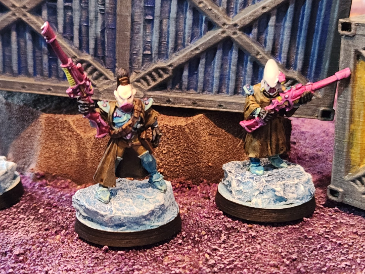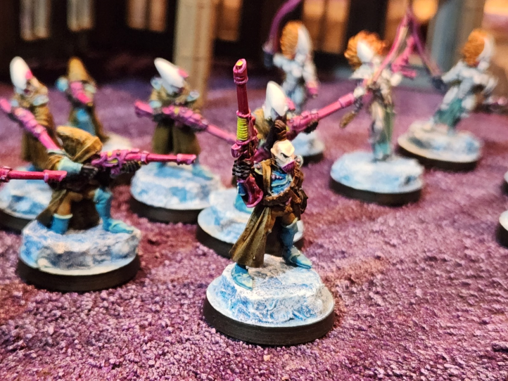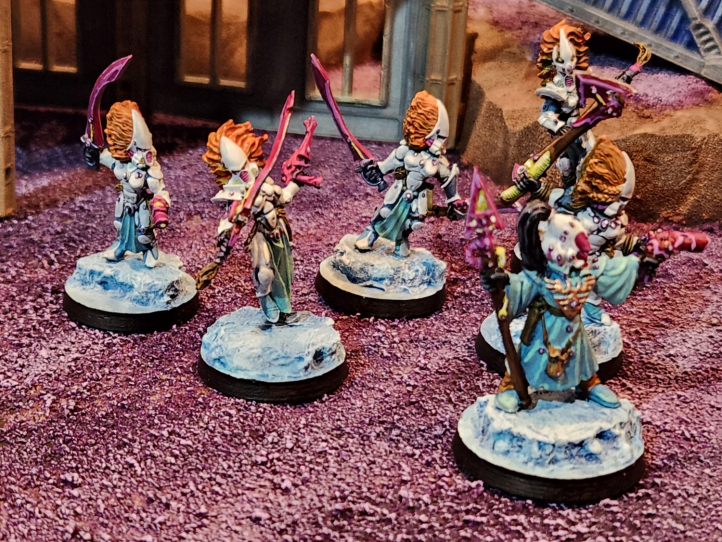 So, this time I painted five Dire Avengers. While they have some variation in colour scheme, it ended up being simpler as intended. Only the one with the decal in the forehead is at the standard I expected. The others, while finished, are going to require further work in order to reach said standard. Hopefully this will come next month. The same goes for the bases. I tried an evolution from the urban debris, but again, only the model with the decal shows the intended result.